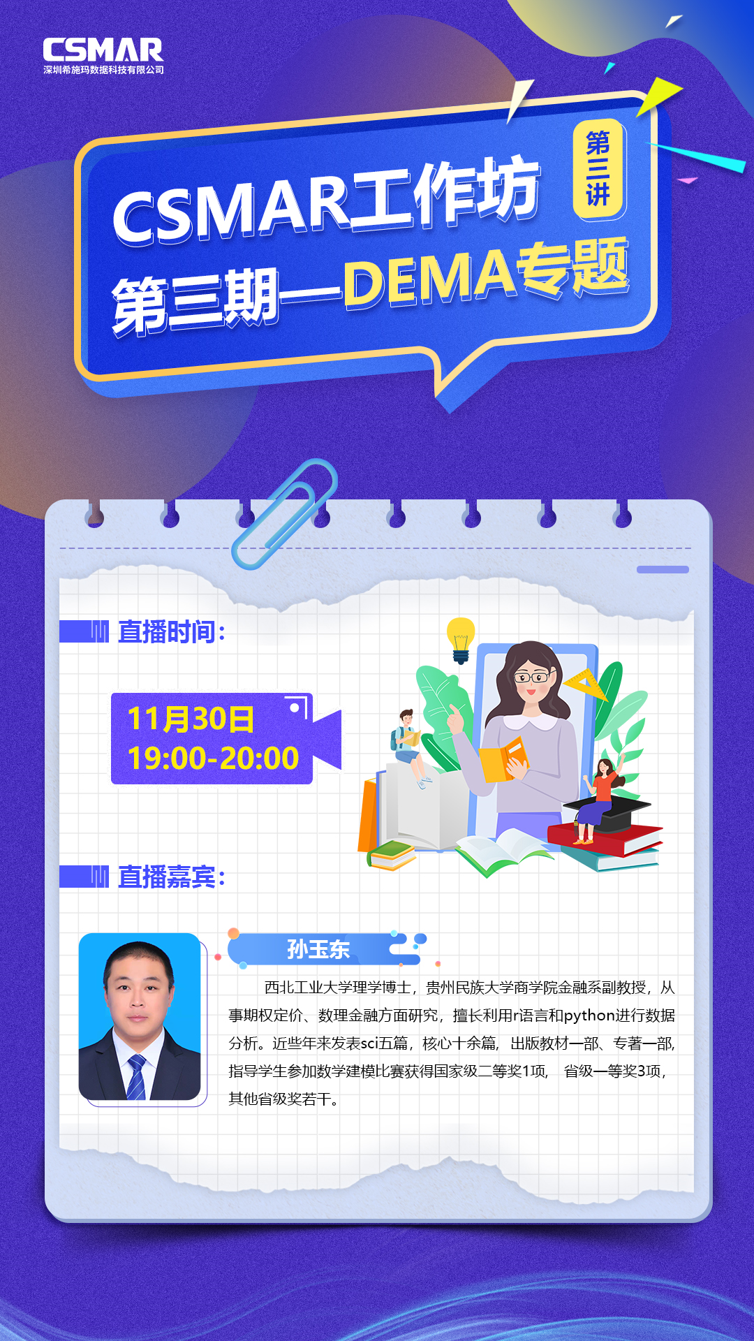 CSMAR工作坊第三期--DEMA专题第二讲课程于2021年11月25日19:00开讲。