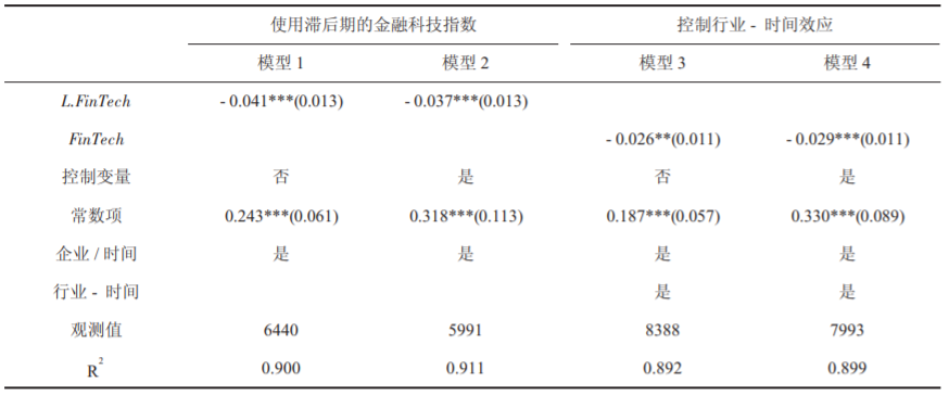 在主回归分析中,文章检验了前文所提的假设。第一时间顺利获得基准回归检验H1,回归结果如下表所示。可见金融科技 (FinTech) 的系数显著为负值。这说明金融科技显著减少了企业“脱实向虚”,验证了研究假设 H1。