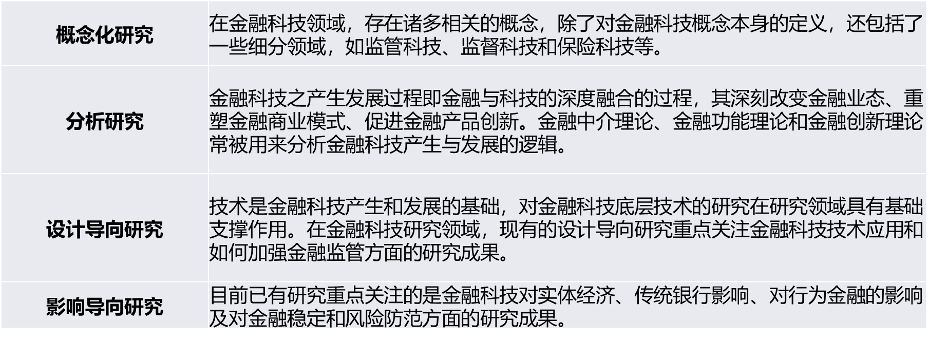 基于“价值空间分类框架”,对金融科技主题的研究按照概念化研究、分析研究、设计导向研究和影响研究进行分类梳理,对已有研究的关注重点总结如下。