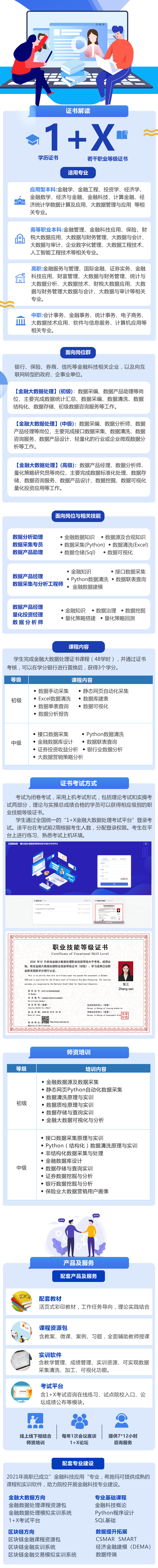 金融大数据处理技能等级证书以金融大数据的采集、清洗、存储、分析、可视化呈现工作为依据,面向经济金融相关各行业,如证券、保险、理财、投资及企业咨询公司,培养金融及大数据技能型人才。