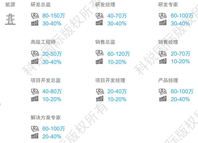 薪酬趋势:行业整体薪酬趋稳,自然涨幅在8-12%,跳槽涨幅在20-30%。能源互联网领域资深人才紧缺,部分职位薪资涨幅可达50%,甚至更高(文中部分数据是猎头公司欧付宝欧付国际专家顾问的分析预测,供企业和猎头招聘参考)