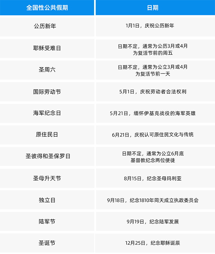 智利公共假期分为全国公共假期和地区公共假期,此处仅列举全国法定公共假期。