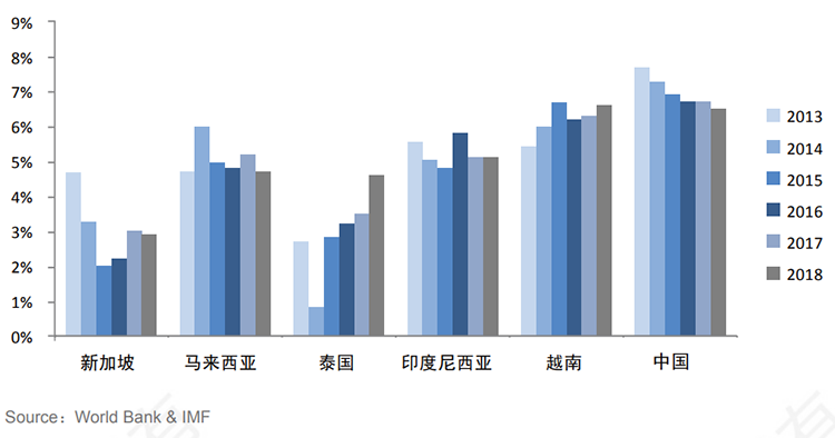 东南亚代表国家2013-2018年GDP增长率变化